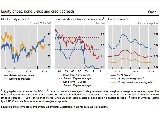 De sterke prestatie van de Europese beurzen, ondanks dat het economisch nieuws slecht was, toont volgens de BIS aan dat de centrale banken achter het stuur zitten en het gedrag van beleggers beïnvloeden. Het vooruitzicht van lage rentes op de obligatiemarkten zette hen om te zoeken naar rendement in bedrijfsobligaties en schuldpapier van de zuidelijke Europese landen. Dus een beweging van de kern naar de periferie. Hiermee werd de uitgifte van staatsleningen in landen zoals Spanje makkelijker. De overvloed aan goedkoop geld tezamen met de lage beweeglijkheid schiep volgens de club van centrale banken een omgeving waarbij risiconemen aangemoedigd werd (zie onderstaande grafiek).