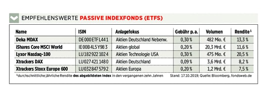 Om kosteneffectief deel te nemen aan de bewegingen van de markten, wordt de aankoop van ETF’s aanbevolen. Deze ontwikkelen zich parallel met geselecteerde beursindexen. Omdat geen expertteams verantwoordelijk zijn voor het beheer van de portefeuille, zijn de jaarlijkse kosten van deze passieve fondsen erg laag. Ze zijn slechts enkele tienden van een procent.