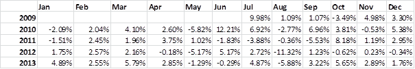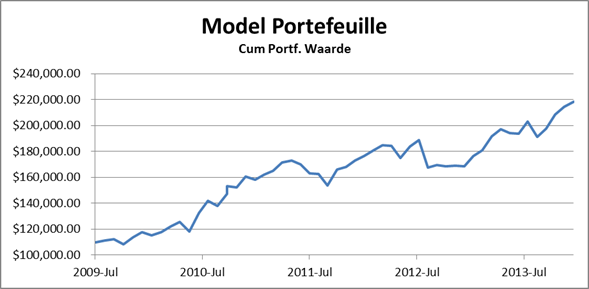 De resultaten van een (hypothetische en genormaliseerde) modelportefeuille over de periode van Juli 2009 tot December 2013 laten de volgende maandelijkse rendementen zien (hierbij zijn de ontvangen dividenden herbelegd).