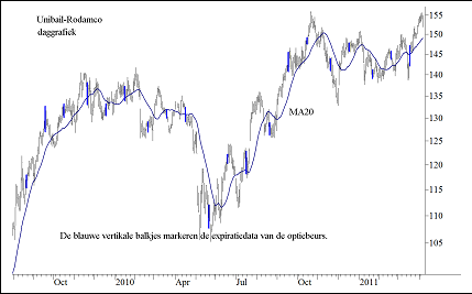 - Controleer de chart en werk met een volgsysteem. Vele beleggers hebben hun eigen preferentie voor een volgsysteem maar als u dat niet hebt neem dan een eenvoudig 20-daags Voortschrijdend Gemiddelde. Als de koers daaronder ligt, blijf dan uit de markt (geen calls schrijven). Als hij daarboven komt verkoopt u uw Call. Als de koers van het aandeel onder de MA20 komt en u hebt nog een uitstaande positie van een verkochte Call, blijf dan rustig zitten en laat de Call expireren. Raak niet in paniek als de koers van het aandeel na expiratie van de Call verder zou dalen. Het aandeel Unibail-Rodamco is sterk genoeg om deze daling weer goed te maken.
