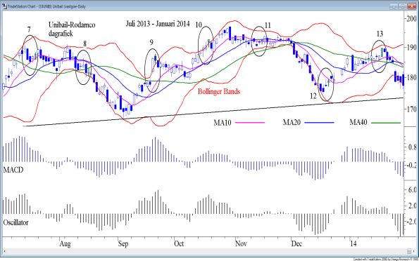 – Op 20 december 2013 opent de koers van het aandeel Unibail op € 178,5. De Call UBL december 2013 195 loopt waardeloos af. Die dag ligt de koers tegen het MA10. Wij wachten op een doorbraak en schrijven dus even niets. Deze doorbraak is de maandag daaropvolgend een feit.