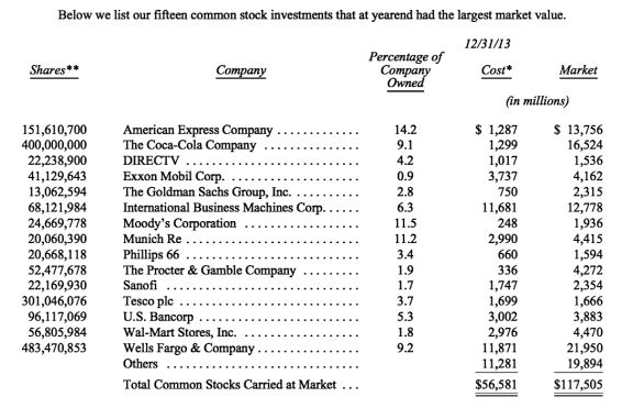 Naast de eigen bezittingen heeft Berkshire Hathaway ook een beperkt belang in een aantal beursgenoteerde bedrijven. Deze portefeuille had per eind 2013 een marktwaarde van