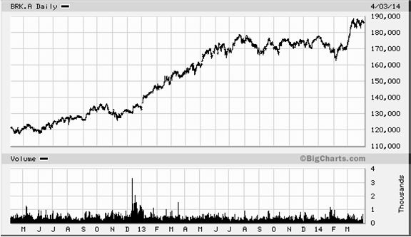 Berkshire Hathaway (NYSE: BRK) is een conglomeraat van bedrijven onder leiding van de wereldbefaamde belegger Warren Buffett. Het bedrijf heeft wereldwijd 330.745 werknemers, maar op het hoofdkantoor van Berkshire Hathaway werken slechts 23 mensen. Gemeten naar de huidige beurswaarde (USD 308 miljard) is Berkshire Hathaway het op drie na grootste bedrijf van de Verenigde Staten, met een FY2013 omzet van USD 182 miljard. De EBITDA over 2013 bedroeg USD 37 miljard, met een EPS (winst per aandeel) van USD 11.849,-. Warren Buffett kreeg op 10 mei 1965 de zeggenschap over de textielfabriek Berkshire Hathaway. De marktwaarde was toen USD 18 miljoen met een boekwaarde van USD 22 miljoen. Omgerekend was dit een boekwaarde van USD 19,46 per aandeel, maar Buffett kocht z’n eerste aandelen voor USD 7,50 per stuk. Eind 1965 sloot het aandeel op USD 19,02 en inmiddels wordt BRK/A (A-aandelen) verhandeld voor maar liefst USD 187.200,- per aandeel. Een kleine 9.842 x hoger dan in 1965!