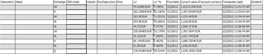 Hieronder een voorbeeld van de portefeuille. Uit respect voor onze abonnees zijn bepaalde gegevens in deze tabel niet vermeld.