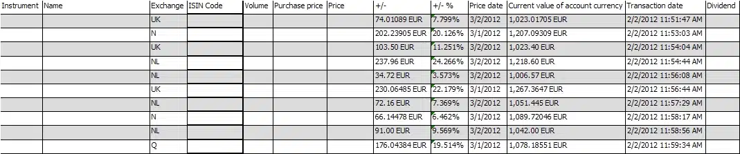 Hieronder een voorbeeld van de portefeuille. Uit respect voor onze abonnees zijn bepaalde gegevens in deze tabel niet vermeld.