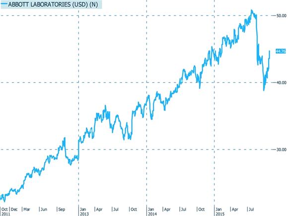 Abbott Laboratories is een voorbeeld van een duurzaam groeiaandeel dat de afgelopen maanden uit de gratie was. Dit Amerikaanse farmaciebedrijf is wereldwijd in meer dan honderdvijftig landen actief in verschillen takken van de gezondheidszorg. Het betreft met name consumentenproducten, breed gespreid over voedings-supplementen, diagnostiek, medische apparatuur – zoals medicijn-afgevende stents- en generieke medicijnen. Meer dan de helft van de omzet wordt buiten de VS gerealiseerd. De onderneming is met eigen distributie- en productiecapaciteit goed vertegenwoordigd in de belangrijke groeimarkten als India, China en Brazilië.