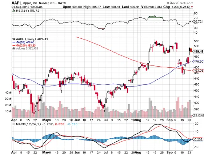 De vraag is, of Apple dit momentum kan vasthouden. Daar zijn wel motieven voor aan te voeren. In de eerste plaats zijn er (bewust) minder 5S toestelletjes dan de vraag groot is. Dat betekent wel, dat er in de laatste week minder toestelletjes verkocht zullen worden dan mogelijk. Het betekent echter ook, dat het bedrijf nu de kans heeft om bij bijzondere gelegenheden, zoals bijvoorbeeld tijdens de presentatie van de cijfers, de 5S extra in het zonnetje te zetten, waardoor verkopen een extra impuls krijgen. Een bijzondere gelegenheid zou kunnen zijn, als Apple er op afzienbare termijn China Mobile erin toestemt iPhones te gaan verkopen. Volgens analisten is in dat geval een koers van $ 540 niet uitgesloten. Dat vertegenwoordigt een opwaarts potentieel van bijna 11% bij een dagkoers van $ 488.
