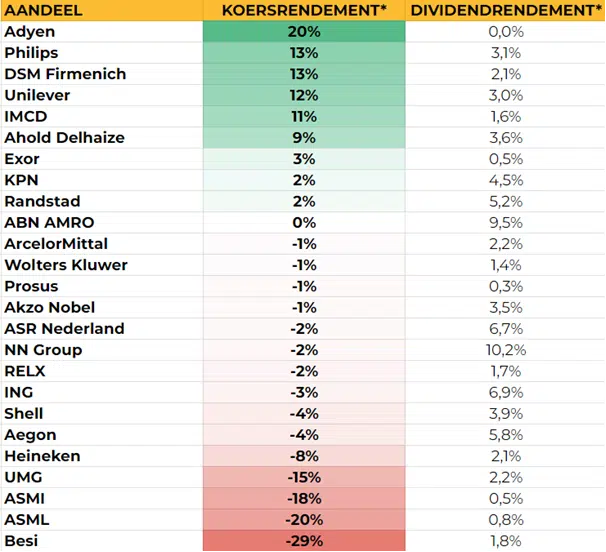 Tabel. Koers- en dividendrendement voor AEX-aandelen