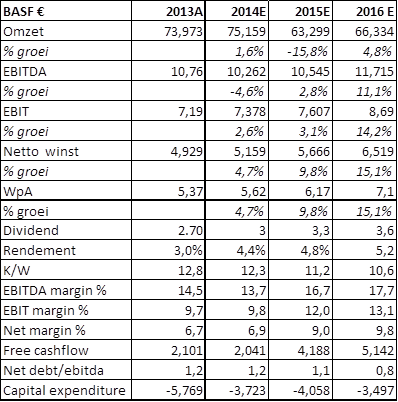 De lage energieprijzen en de matige economische ontwikkeling is voor BASF misschien toch een blessing in disguise. Het bedrijf gaat saneren en doet alles wat niet aan de eigen eisen voldoet de deur uit. Dat betekent, dat er straks een sterk en gediversifieerd chemiebedrijf overblijft. Daar zal het zeker profijt van hebben als de rust op de energiemarkt is weergekeerd en ook het herstel in Europa eindelijk handen en voeten krijgt. Op de lange termijn is Basf daarom een absolute aanrader. Dat is waarschijnlijk teveel gevraagd voor de korte termijn. Daarom hoort het aandeel eerder thuis in een offensieve portefeuille, dan in een defensieve of gebalanceerde, ook al is het aandeel spotgoedkoop. Voor beleggers met geduld en doorzettingsvermogen is er als pleister op de wonde van de zwakke koersontwikkeling een aantrekkelijk dividendrendement, dat komende jaren tot boven 5% gaat stijgen!