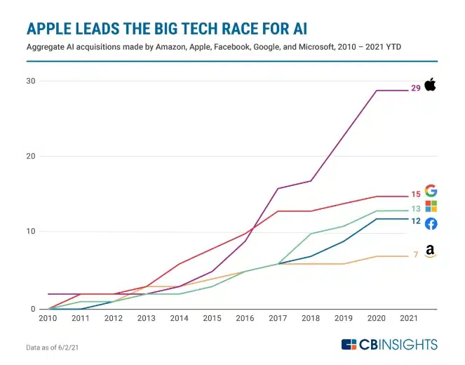 Grafiek 1: Geaggregeerde AI-overnames door Amazon, Apple, Facebook, Google en Microsoft 2010-2021 YTD