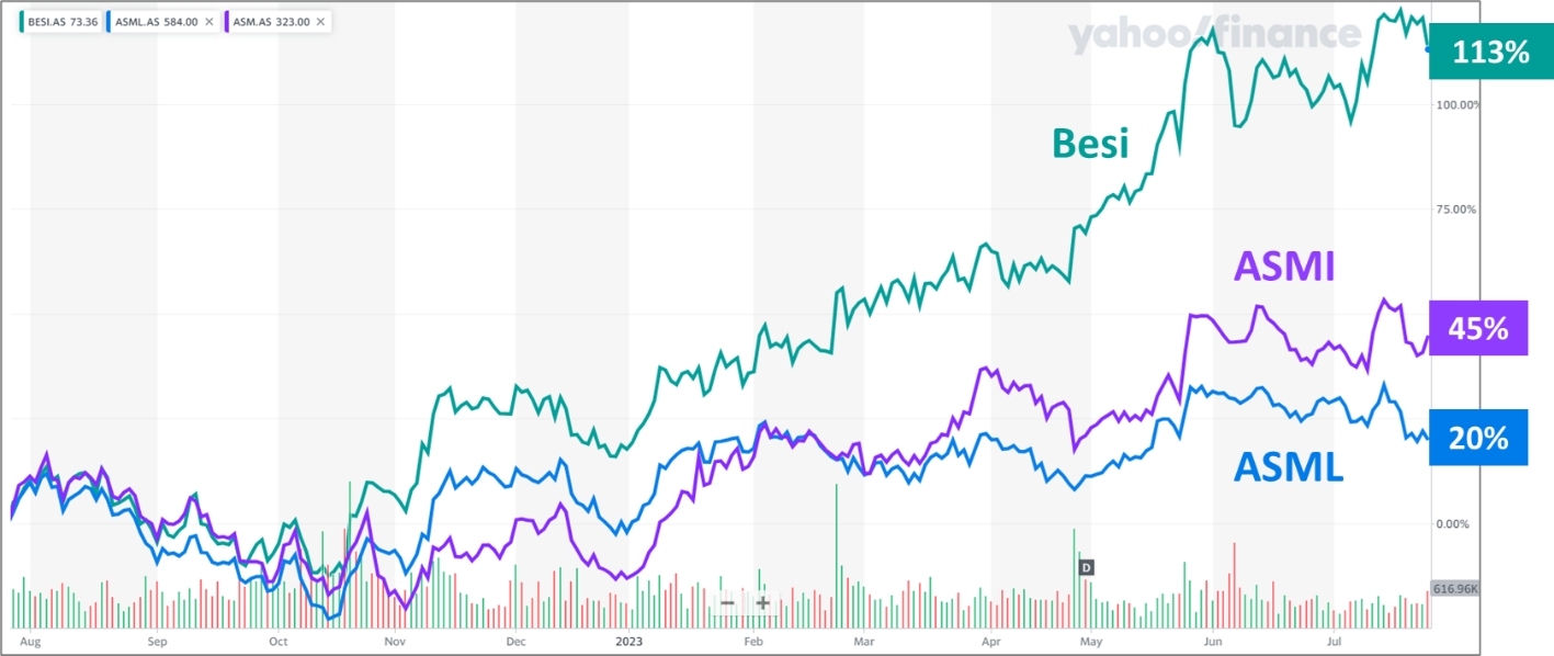 Van de drie chipbedrijven in de AEX Index is Besi het meest conjunctuurgevoelig. Het bedrijf levert machines voor de verpakking van chips aan het einde van de keten, terwijl ASML en ASMI juist machines leveren voor de fabricage aan het begin van het proces. Door de hard opgelopen rente is er in de Verenigde Staten en Europa sprake van laagconjunctuur en angst voor een recessie. In China krijgt de overheid de economie nog niet goed aan de praat na jaren van strenge lockdowns en overcapaciteit in de vastgoedsector.