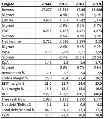 Die strategie lijkt een juiste. Zoals gezegd groeide Colgate amper of niet op de thuismarkt, maar dat deed de concurrentie evenmin. Colgate heeft echter buiten de VS door zijn aanpak een voorsprong op diezelfde concurrentie. Hoewel 2015 ongetwijfeld een heel moeilijk jaar zal blijven denken we dat de lange termijnstrategie van het bedrijf zich vanzelf gaat uitbetalen. Nu al slaagt het bedrijf erin om de marges op peil te houden en hier en daar zelfs te verbeteren. Hoewel het aandeel met een koers-winstverhouding van 20,8X voor 2016 aan de prijs is, denken we toch dat het aandeel geschikt is voor alle drie de portefeuilles.