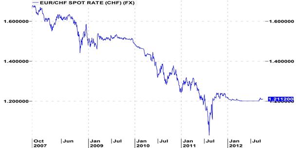 De problemen in de eurozone leidden al enkele jaren tot een kapitaalvlucht naar veilige havens. De Zwitserse frank is zo’n toevluchtsoord. Ondanks interventies van de centrale bank, de SNB, bleef de koers van de frank stijgen tot bijna pariteit met de euro. De Zwitserse exportindustrie klaagde steen en been. In de herfst vorig jaar nam de SNB de uitzonderlijke stap aan te kondigen dat een EUR/CHF koers onder de 1,20 niet zou worden getolereerd. De bank zou deze koers afdwingen en zo nodig ongelimiteerd franken uitgeven om euro’s aan te kopen: zie grafiek,