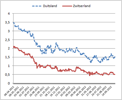 Grafiek: Kapitaalmarktrente Duitsland en Zwitserland. Bron: VWD