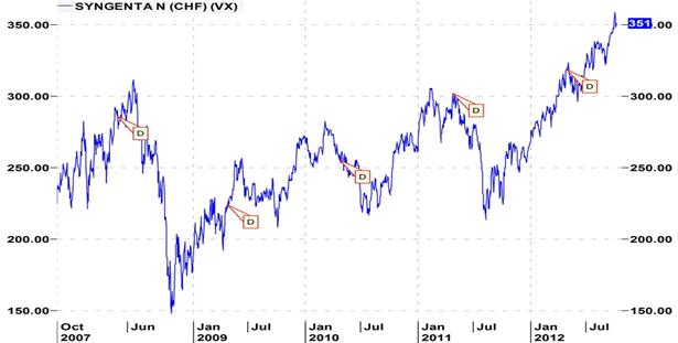 Grafiek: Koersontwikkeling Syngenta Bron: VWD