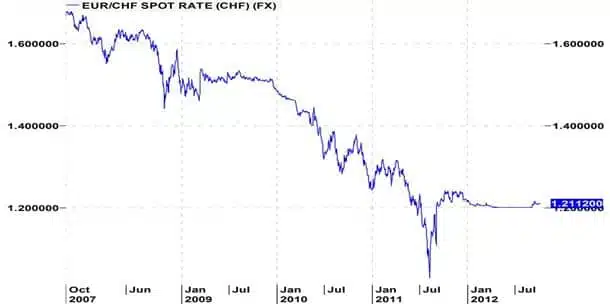 De problemen in de eurozone leidden al enkele jaren tot een kapitaalvlucht naar veilige havens. De Zwitserse frank is zo’n toevluchtsoord. Ondanks interventies van de centrale bank, de SNB, bleef de koers van de frank stijgen tot bijna pariteit met de euro. De Zwitserse exportindustrie klaagde steen en been. In de herfst vorig jaar nam de SNB de uitzonderlijke stap aan te kondigen dat een EUR/CHF koers onder de 1,20 niet zou worden getolereerd. De bank zou deze koers afdwingen en zo nodig ongelimiteerd franken uitgeven om euro’s aan te kopen: zie grafiek,