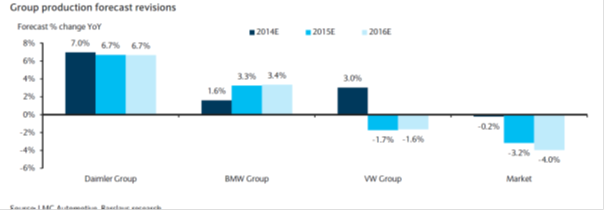 De claim, dat Daimler in 2014 en de jaren daarop weleens sneller kan groeien dan de markt is ook af te leiden uit cijfers van onderzoeksbureau LMC. Dat voorspelt, dat de groei van de productie bij Mercedes de komende jaren die van de naaste concurrentie royaal gaat overtreffen. Die prestatie is des te opmerkelijker, omdat LMC ervan uitgaat, dat de markt komende jaren gaat krimpen. Die mooie prestatie van Daimler is te danken aan de introductie van nieuwe modellen. Daimler gaat wat dat betreft aan kop vòòr BMW en Audi.