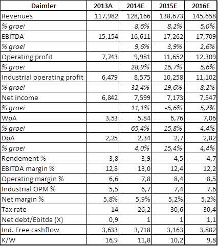 Na een reeks van magere jaren lijkt Daimler in graziger weiden terecht gekomen. Het bedrijf heeft in 2014 met veel succes veel nieuwe modellen in de markt gezet, die duidelijk aanslaan bij de consument. Tot 2020 is Daimler voornemens nog zeker 11 nieuwe modellen te introduceren. Daarmee bouwt het een voorsprong op de concurrentie die de consument een relatief verouderd wagenpark te bieden heeft! De verwachting is dan ook, dat Daimler de markt komende jaren gaat verslaan. Omzet en winst zullen versneld gaan toenemen. Daar komt nog bij, dat Daimler meer dan € 17 miljard in kas heeft. Het management heeft al laten weten, dat het dividend wel eens versneld kan stijgen. Investeringen in het eigen bedrijf hebben echter prioriteit!
