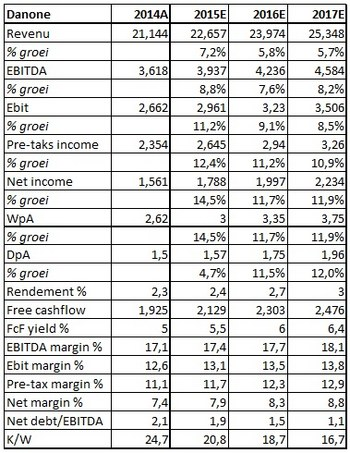 Op basis van de bevindingen over het eerste kwartaal verwacht Danone voor heel 2015 een groei van tenminste 4% – 5%. Het beste nieuws is misschien wel, dat er eindelijk weer eens een margeverbetering in het vat zit. De marges hebben het enkele kwartalen op rij zwaar te verduren gehad door de eerder genoemde problemen bij de Zuivel. In 2015 lijkt de lang verhoopte ommekeer op te treden. Dat is vooral te danken aan een betere prijsmix dankzij dalende melkprijzen. Het is misschien nog iets te vroeg om van een serieuze turnaround te spreken, maar Danone lijkt met de resultaten over het eerste kwartaal weer de weg omhoog gevonden te hebben.