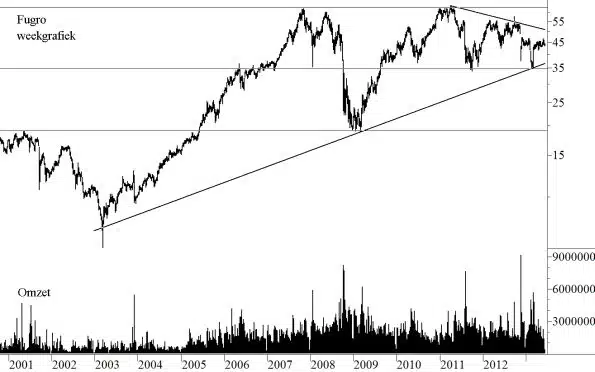 De laatste toets is de feitelijke technische positie. En daarvoor verwijzen wij naar figuur 1. Hierin hebben wij een meerjarige grafiek (2001 – 2013) van de koersontwikkeling van Fugro opgenomen (weekkoersen).