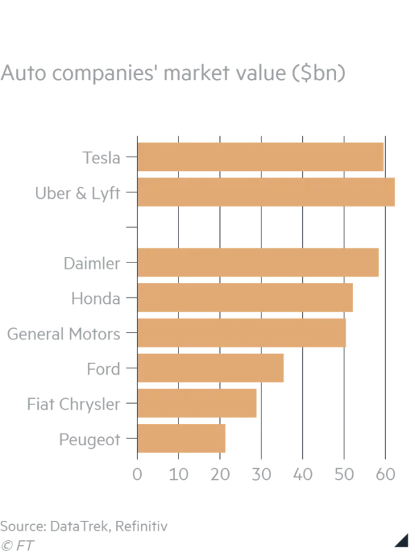 De droeve aanblik van de energiesector gaat hand in hand met die van de automobielsector. Die gaat gebukt onder een kopersstaking in China. Maar dat is het niet alleen. De belegger kijkt ook naar de snelle opmars van de elektrische auto en de trend naar ride sharing. Ook in dit opzicht levert de koersontwikkeling op de beurs een even merkwaardige als waarschuwende aanblik. De marktkapitalisatie van het amper renderende Tesla en die van verlieslatende partijen als Uber en Lyft liggen boven die van de grote automerken, maar die maken wel winst en genereren aanzienlijke kasstromen. De markt lijkt bang, dat zulks niet lang meer het geval zal zijn.