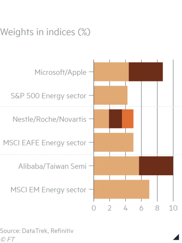 Die opstelling heeft nu al opmerkelijke gevolgen. Apple en Microsoft hebben een gezamenlijke marktkapitalisatie van pakweg $ 2,3 biljoen. Daarbij vergeleken is Saudi Aramco Klein Duimpje. Maar het is nog erger. De weging van de twee techbedrijven in de S&P 500 is groter dan dat van de hele large cap S&P energy sector. De energiesector gaat gebukt onder de wel heel onzalige combinatie van overaanbod van olie vandaag en groeiende zorgen over de toekomst van CO2 genererende energiebronnen. Dat betekent dat het heel moeilijk is om waarderingen te laten stijgen.