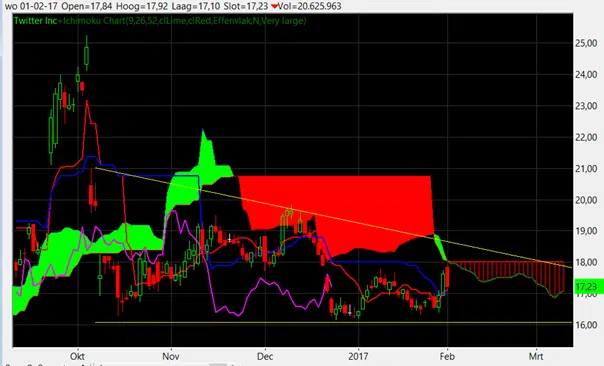Op dagbasis is er onlangs een ‘golden cross’-koopsignaal gegenereerd. Bij een koers van $17 zijn de voortschrijdende gemiddelden Tenkan Sen-lijn (rood) en de Kinjun Sen-lijn (blauw) elkaar positief gekruist. Het is evenwel niet zo fraai dat de koers nog aan de onderkant van de Ichimoku Cloud (hier de roodgestreepte wolk) beweegt