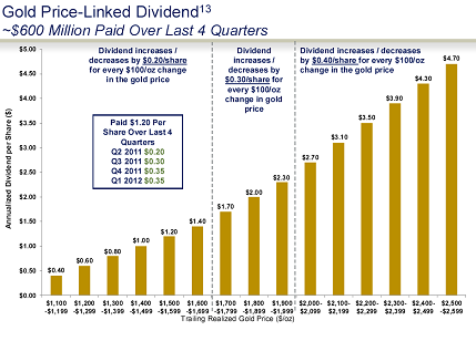Dit vertrouwen wordt vertaald in een nieuwe dividendpolitiek waarbij de hoogte van het dividend wordt gekoppeld aan de prijs van goud. Momenteel krijgen de aandeelhouders een dividendrendement van 2,3%. Als goud boven 1700 dollar stijgt, verhoogt men het dividend naar 2,5%. Bij het doorbreken van de 2000-dollar-barrière gaat het dividend naar 3,5% à 4% of meer! Op basis van de in het 1e kwartaal gerealiseerde goudprijs van $ 1.684 kondigde de RvB voor het 2e kwartaal een ongewijzigd dividend aan van $ 0,35 ten opzichte van het voorgaande kwartaal.