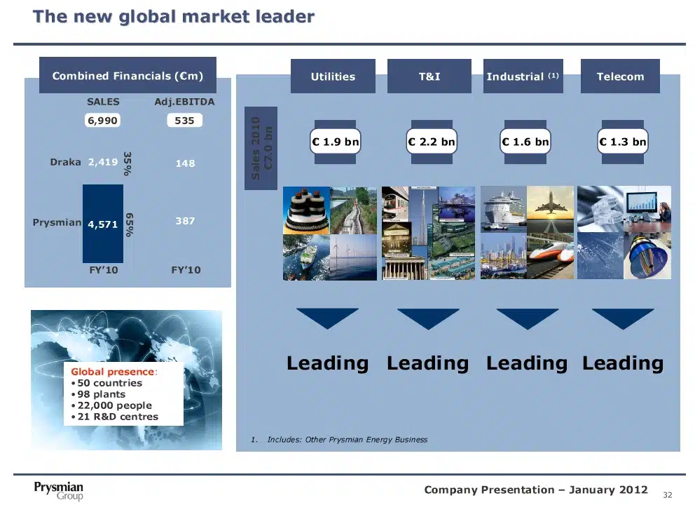 Prysmian is gespecialiseerd in de productie en distributie van kabels, besturingssystemen en allerhande accessoires voor energieleveranciers en telecommunicatie-industrie.