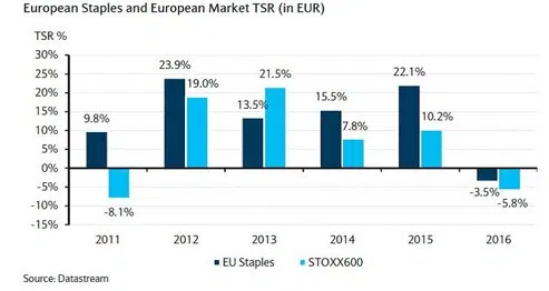 Beleggers, die de afgelopen jaren in de sector Europese Consumer Staples geïnvesteerd hebben, zullen daar geen spijt van gehad hebben. Dat leert een snelle blik op bovenstaande grafiek. Ook 2015 was weer een mooi jaar, waarin de sector de bredere markt met straatlengten versloeg. De hamvraag is derhalve of al dat moois ook in 2016 terug te zien zal zijn?