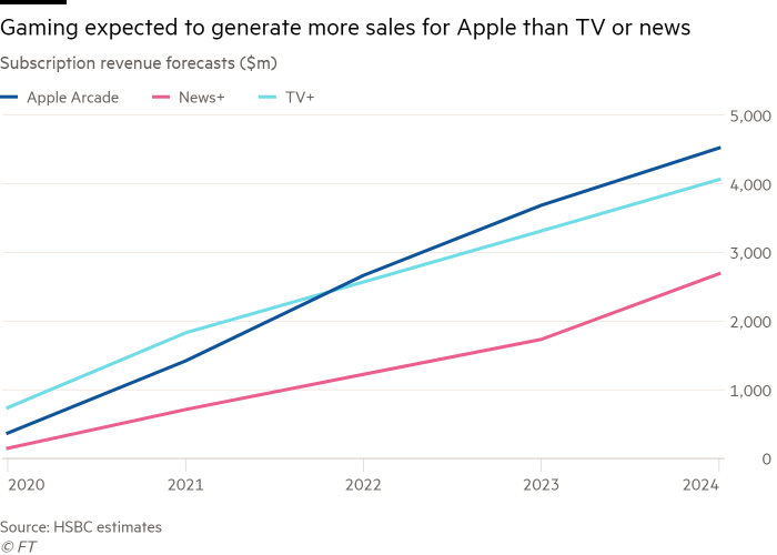 Het kan dus zomaar dat Arcade veel belangrijker en lucratiever gaat worden dan TV+. Bij de bank HSBC zijn ze daar al van overtuigd. Ze schatten daar dat Apple Arcade in 2020 al een omzet zal bereiken van $ 370 miljoen, in 2022 $ 2,7 miljard om in 2024 alweer gegroeid te zijn naar $ 4,5 miljard. Arcade heeft dan 29 miljoen abonnees die $ 12,99 per maand betalen. De schattingen voor Apple TV+ komen een stuk lager uit. In 2022 zal de omzet $ 2,6 miljard bedragen en in 2024 $ 4,1 miljard.