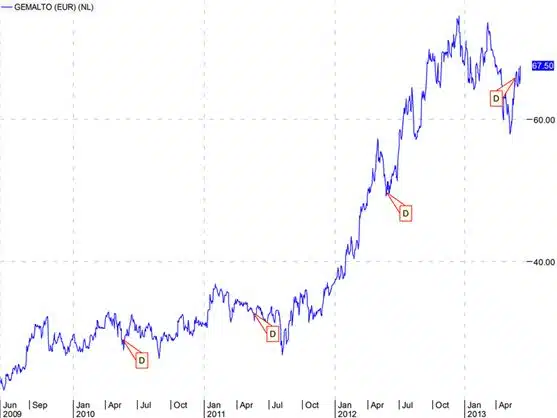 De koersgrafiek geeft aan welke koerssprong het aandeel sinds eind 2011 heeft gemaakt: van rond de € 20 naar € 67,70 nu. Bij deze koers bedraagt de marktkapitalisatie € 5,8 mrd, te vergelijken met Randstad. 19 analisten volgen Gemalto, waarvan 14 het op kopen of overwegen houden, 1 op houden en 3 op verkopen/onderwegen. Van het dividend moet de belegger het niet hebben. Sinds 2009 wordt er uitgekeerd: € 0,34 over 2012 (ex-div. 23/5/2013).