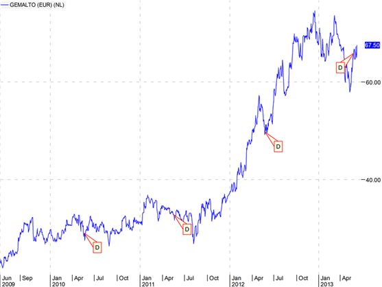 De koersgrafiek geeft aan welke koerssprong het aandeel sinds eind 2011 heeft gemaakt: van rond de € 20 naar € 67,70 nu. Bij deze koers bedraagt de marktkapitalisatie € 5,8 mrd, te vergelijken met Randstad. 19 analisten volgen Gemalto, waarvan 14 het op kopen of overwegen houden, 1 op houden en 3 op verkopen/onderwegen. Van het dividend moet de belegger het niet hebben. Sinds 2009 wordt er uitgekeerd: € 0,34 over 2012 (ex-div. 23/5/2013).