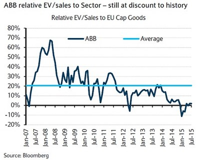 EV is vaak beschouwd als het bedrag dat het bedrijf waard is in geval van een overname. Van een op zichzelf staand Automation bedraagt 2,3x de omzet terwijl die van Power-equipment producenten niet verder komt dan ongeveer 1x. De EV van ABB bedraagt 1,4x. Hiermee is het bedrijf een achterblijver in de sector.