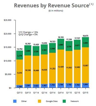 De sterke financiële positie komt niet zomaar uit de lucht vallen, maar is de uitkomst van de goede prestaties van het kernbedrijf. Het derde kwartaal van 2015 voldeed het bedrijf weer ruimschoots aan de verwachtingen. De omzet van alle sites en netwerken steeg met 13% tot een waarde van $ 18,68 miljard. Nadelige valutaeffecten kostte het bedrijf $ 1,3 miljard. Het operationele resultaat bedroeg $ 6,14 miljard en dat was in lijn met wat Wall Street verwachtte. De winst per aandeel van $ 7,35 was iets boven consensusverwachting van $ 7,20.