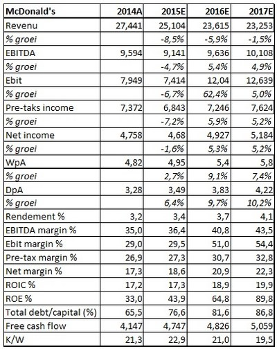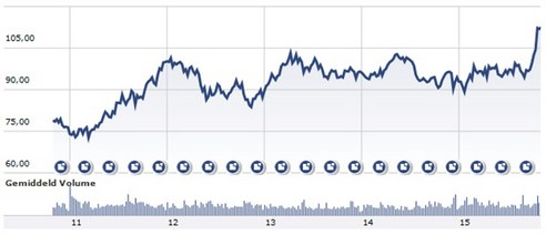 Beleggers reageerden opgetogen op de cijfers over het 3de kwartaal. De koers schoot bijna 8% omhoog en is sindsdien niet meer gedaald. Daarmee heeft het aandeel zijn aantrekkelijkheid nog niet verloren. Met een koerswinstverhouding van 21x voor 2016 loopt McDonalds in de pas met de sector. Als de turnaround werkelijkheid blijkt en de winstgevenheid herstelt zich weer, dan kan de koerswinstverhouding zelfs nog wat verbeteren. Daarmee verbetert de aantrekkelijkheid van het aandeel. Wij denken dat het aandeel geschikt is voor elke beleggingsportefeuille!