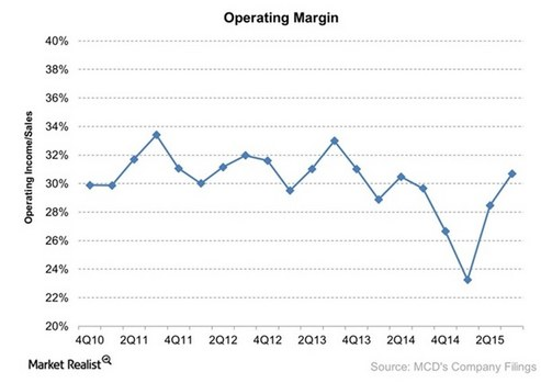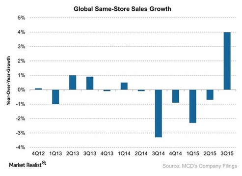 Het goede nieuws kwam eerder dan verwacht en wel bij de presentatie van de cijfers over het 3de kwartaal. De verwachtingen voor dit kwartaal waren allerminst hooggespannen. Het idee overheerste dat de omzet wel eens met 8% zou gedaald kunnen zijn ten opzichte van de resultaten van een jaar eerder. De kans op een succesvolle turnaround in Azië leek nog gering terwijl het initiatief in de Verenigde Staten om de hele dag een ontbijt te serveren nog te recent was om echt een wezenlijke bijdrage te leveren aan een herstel. De praktijk zag er echter onverwacht veel beter uit. Weliswaar daalde de omzet met 5% naar een bedrag van $ 6,6 miljard maar de daling was uitsluitend toe te schrijven aan een stevige valutaire tegenwind. Daarvoor gecorrigeerd zou McDonalds een groei hebben laten zien van 7%. De nettowinst steeg echter met 23% en ook de winst per aandeel deed het uitstekend met een stijging van 28% naar $ 1,40 waar op $ 1,27 was gerekend. Zonder meer opmerkelijk en zeker geruststellend dat de zogeheten same-store-sales wereldwijd een plus lieten zien. Dat was al meerdere kwartalen niet meer het geval geweest. Het herstel van de same-store-sales ging bovendien gepaard met een herstel van de marges.