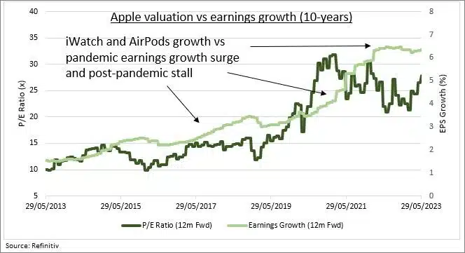 Nieuwe omzetgroei kan het aandeel Apple goed gebruiken. De koers is in 2023 tot nu toe met 38% gestegen, wat bijna vier keer zoveel is als de S&P 500 Index. Dat is opvallend, omdat de winstgroei na de coronapandemie juist is gestagneerd (zie grafiek). De verhouding tussen de koers en de verwachte winst is daardoor opgelopen tot 27x, wat duidelijk hoger is dan het lange-termijngemiddelde van 21x. Een nieuwe kaskraker is daarom zeer welkom.
