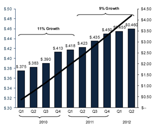 BreitBurn keert over 2012 een dividend uit van $ 1,84 per aandeel. Tegen de huidige koers van $19,03 is dit maar liefst 9,66%. Dit dividend wordt per kwartaal uitgekeerd. Voor het 9e kwartaal op rij heeft het bedrijf haar dividend verhoogd.