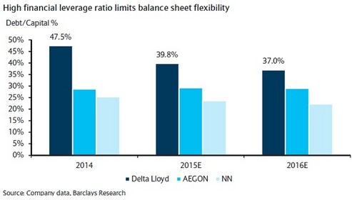 Bij de trading update in mei van dit jaar verklaarde het management dat de solvabiliteitsratio van Delta Lloyd was gestegen van 183% in 2014 naar 208% in het eerste kwartaal van 2015. Die stijging was vooral te danken aan een succesvolle emissie in maart van dit jaar. Dat klinkt allemaal mooi en geweldig maar daar moeten toch kanttekeningen bij gezet worden. De meting van de solvabiliteit is gebaseerd op een intern model en leunt sterk op zogeheten ‘diversification benefits’. Het is maar de vraag of deze benefits voor Delta Lloyd wel zo sterk zijn gelet op de beperkte geografische spreiding van het bedrijf en op de eveneens beperkte business mix. Delta Lloyd lijkt in het bijzonder kwetsbaar voor schommelingen van de rente. Het is met andere woorden nog maar de vraag of de toezichthouder mee gaat in de berekeningswijze van Delta Lloyd. We hebben hierboven al gesteld dat DNB zich conservatief zal opstellen als het om de invulling van Solvency II gaat. Dat kan impliceren dat de Bank een standaard benadering zal eisen en in dat geval kan de solvabiliteit van Delta Lloyd wel eens fors lager uitvallen.