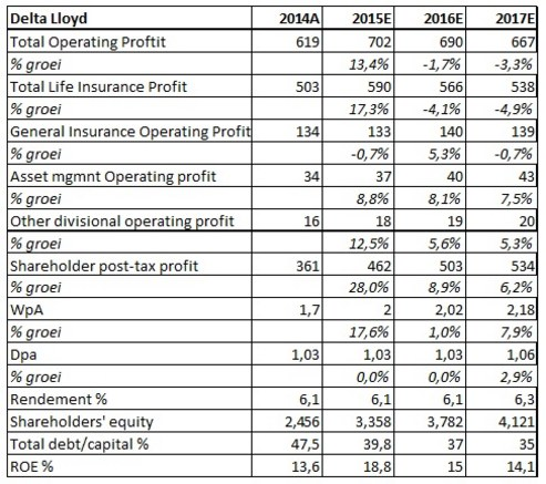 Over 2014 mocht Delta Lloyd mooie cijfers noteren. Het netto-inkomen verdubbelde nagenoeg en kwam uit op een bedrag van € 361 miljoen. Ook de winst per aandeel (wpa) liet met 87% een formidabele groei zien. De wpa kwam uit op € 1,70. Delta Lloyd biedt met 6,1% zijn aandeelhouders een niet te versmaden dividendrendement. Het dividend per aandeel kwam uit op € 1,03. Op moment van schrijven bedraagt de marktkapitalisatie € 2,99 miljard.