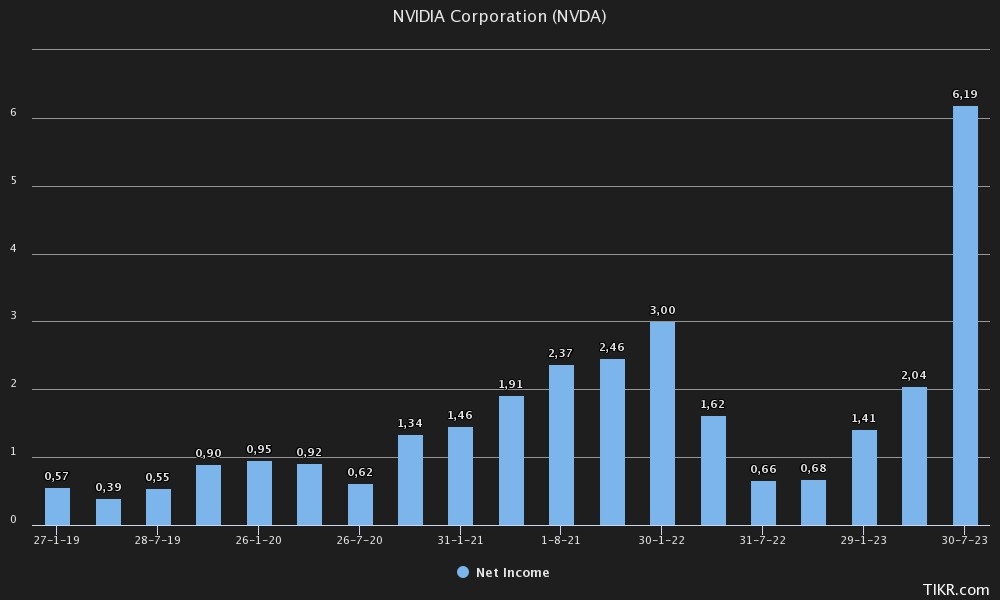 Nvidia: nettowinst per kwartaal van 2019-2023 Q2 (in USD)