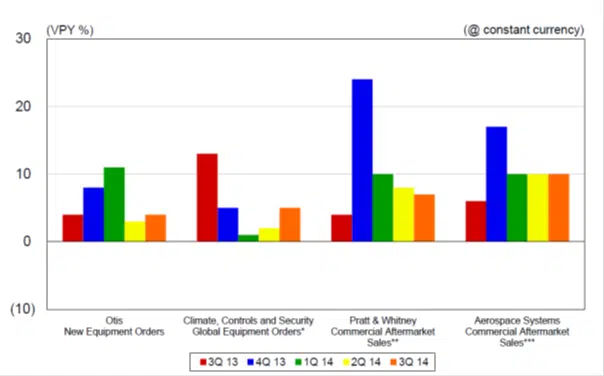 Het industriële conglomeraat United Technologies deed het verrassend goed in het derde kwartaal van 2014. Verwachtingen waren bepaald niet hoog gespannen gelet op vooral een zwak Europa en volatiele valutaverhoudingen. De omzet liet een organische groei zien van bijna 5% en kwam uit op een bedrag van $ 16,2 miljard. Dat was in lijn met wat de markt verwachtte, maar United was met deze groei wel koploper in zijn sector. De winst explodeerde echter en steeg met 31% naar een bedrag van $ 1,9 miljard. De winst per aandeel kwam uit op $ 2,04, maar gecompenseerd voor incidentele bijdragen kwam er uiteindelijk $ 1,82 op de borden te staan.