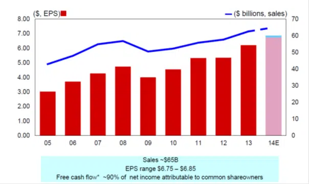 Voor heel 2014 herhaalde het management zijn eerdere verwachtingen. De omzet komt uit op $ 65 miljard tegen $ 62,6 miljard in 2013. De winst per aandeel zal uitkomen tussen $ 6,75 – $ 6,85 tegen $ 6,21 in 2013. Het bedrijf gaat in 2014 voor een bedrag van $ 1,5 miljard eigen aandelen inkopen.