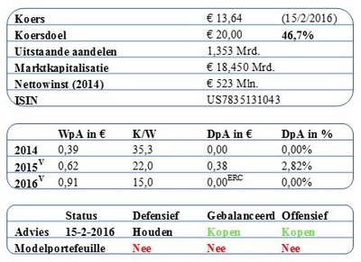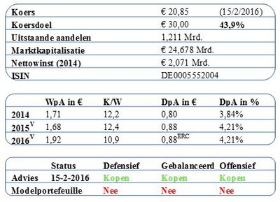 De markt voor het internationaal bezorgen van pakketjes is in de loop van 2015 ingezakt door groeiende problemen in de opkomende landen en vooral de olieproducerende landen. En hoewel er op korte termijn weinig verbetering wordt verwacht, zijn wij van mening dat Deutsche Post op termijn zal herstellen door de trend van stijgende verkopen van webshops. Deutsche Post lijkt zich reeds voorbereid te hebben op een periode van lage groei, waardoor eerder geformuleerde groeidoelstellingen tot 2020 haalbaar blijven. Er is hard gewerkt aan een verdere rationalisering van het bedrijf en het gezond maken van de balans. Het bedrijf denkt zelf dat een EBIT van ⬠3,4 miljard (+10%) in 2016 nog steeds zeer haalbaar is. Deutsche Post heeft een aantrekkelijke dividendrendement van ruim 4% en redelijke groeivooruitzichten.