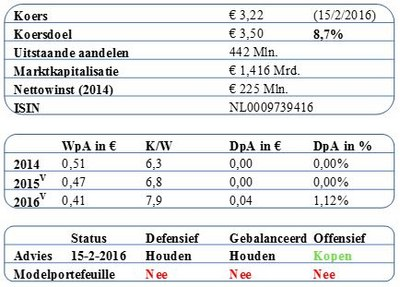 Een belangrijk aspect bij PostNL is het ontbreken van een dividenduitkering. Nagenoeg elke concurrent keert een dividend uit. De kans dat daar in 2016 verandering inkomt lijkt gering. Betere resultaten door eerdere bezuinigingen en herstructureringen zullen langzamer doorwerken door verdere marktliberalisering. PostNL heeft vooralsnog wel een aantrekkelijke vrije cash flow en door zijn omvang geldt PostNL als een overnamekandidaat. Er zou serieuze belangstelling van het Britse Royal Mail of van Deutsche PostNL kunnen komen. PostNL is alleen maar geschikt voor offensievere portefeuilles.