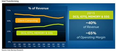 Natuurlijk is men zich bij Intel er scherp bewust van de veranderende markt voor halfgeleiders. Het is er zich van bewust dat de markt voor smartphones en tablets grotendeels aan Intel is voorbijgegaan. Intel is dus druk bezig om die omissie weg te poetsten. Daarin is het bedrijf nog niet zo succesvol. Op de Capital Markets Day in november van 2015 betoogde het management dat er nog zeker $ 800 miljoen aan verliezen weggepoetst moeten worden in de divisie Mobile.