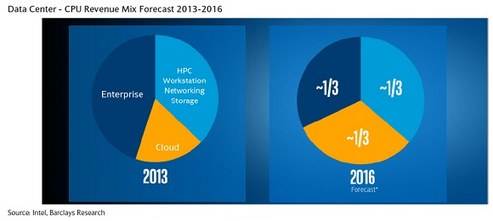 Intel verwacht dat the Cloud en daarmee de data centra de komende jaren explosief blijft groeien. Dat is te danken aan de snelle ontwikkeling van the Internet of Things (IoT). Toepassingen voor IoT nemen met de dag toe in bijvoorbeeld de auto, het transport of in de ontwikkeling van zoiets als the smart home. Al deze data gaan worden opgeslagen in the Cloud en Intel is een van de partijen die dat mogelijk moet en kan maken. Nu al is deze trend zichtbaar in de samenstelling van de omzet van de divisie Data Center Group (zie onder).