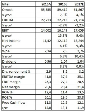 Intel denkt dat het geen vorm van wensdenken is. Het bedrijf is nog steeds in staat om veel meer te investeren in deze segmenten dan de gemiddelde competitie. Het probleem voor Intel is dat al deze aantrekkelijke vergezichten deels nog toekomstmuziek zijn. De harde realiteit van alledag is dat er steeds minder PC’s verkocht worden en de halfgeleider voor de PC/laptop is nog steeds de kern van het bedrijf. Dat betekent onzes inziens dat de koers van het aandeel de komende maanden weinig opwaarts potentieel heeft. Het heeft evenmin veel neerwaarts potentieel omwille van de programma’s voor terugkoop van eigen aandelen en het groeiend dividendrendement dat in 2016 zal uitkomen boven 3%. Onder deze omstandigheden denken we dat een Houdenadvies op zijn plaats is!