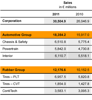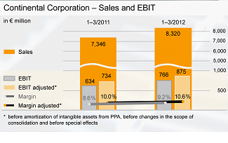 Voor 2012 heeft Continental zich als doel gesteld om met 5% te groeien naar een omzet van € 32 miljard. Aan de hand van de cijfers uit het eerste kwartaal is Continental op de juiste weg. In het eerste kwartaal was de omzet (€ 8,3 miljard) 13,3% hoger ten opzichte van vorige jaar. Ook de EBIT (Earnings before Interest en Taxes) steeg met 21% ten opzicht van Q1 2011. De nettowinst toekomend aan de aandeelhouders steeg met 31% procent tot circa € 483 miljoen, wat overeenkomt met een winst per aandeel van € 2,4. Vorig jaar was dat € 1,84.